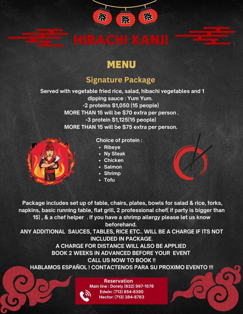 Complete Signature Package: veggie fried rice, salad, hibachi veggies, and 2-3 proteins (ribeye, salmon, shrimp, chicken, tofu). Includes full setup (tables, chairs, décor, flat grill, chef team). Prices for 15 guests, with extra costs per person. Book 2 weeks ahead in Houston & nearby areas.
