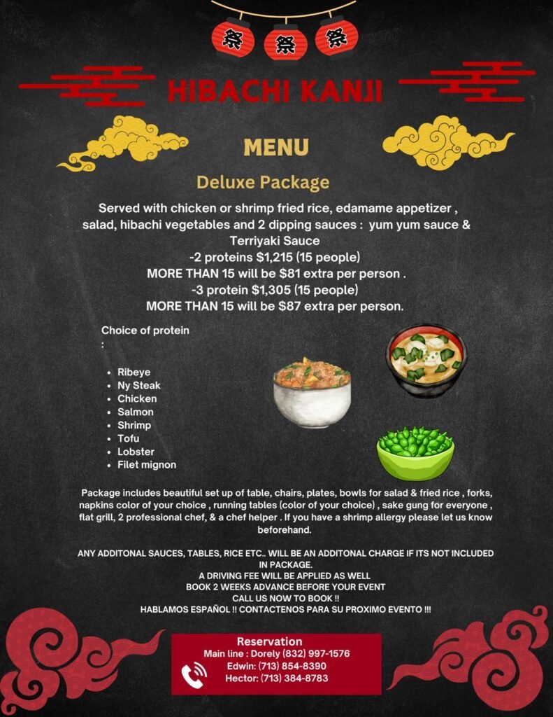 Deluxe Package with chicken or shrimp fried rice, edamame, salad, hibachi veggies, 2 dipping sauces, and 2-3 premium proteins (ribeye, salmon, shrimp, filet mignon, tofu). Includes full setup, décor, flat grill, sake for all. Book 2 weeks in advance in Houston and surrounding cities.