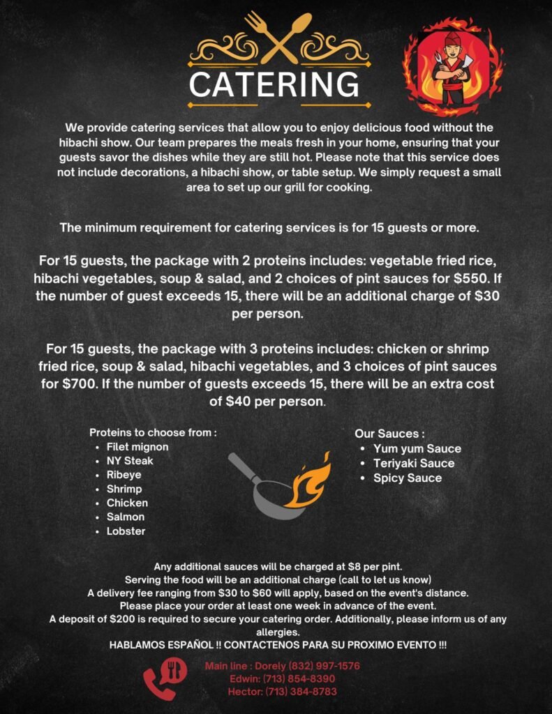 Fresh hibachi-style catering cooked at your home, no show included. Includes 2-3 proteins, fried rice, hibachi veggies, soup, salad, and sauces. No décor/setup—just space for the grill. Prices for 15 guests, with per-person add-ons. Book 2 weeks ahead in Houston & surrounding areas.